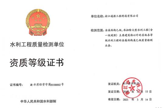 今日經(jīng)浙江省水利廳批準(zhǔn),我司(浙江通源工程科技有限公司)再喜添金屬結(jié)構(gòu)檢測乙級(jí)資質(zhì)。